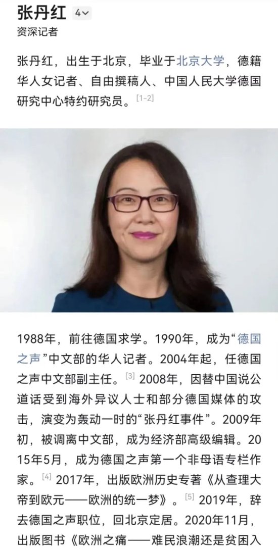 公开消息显示,张丹红是德籍华人,德国著名经济记者。毕业于北京大学西语系德国语言文学专业,著有《从查理大帝到欧元》一书。该书在豆瓣评分为7.4分。