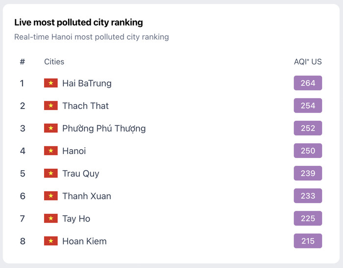 本周当地的污染程度可能是世界卫生组织建议水平的50倍。在其他国际机构的监测中,河内本周已多次登顶,今年1月份也曾位居第一。
